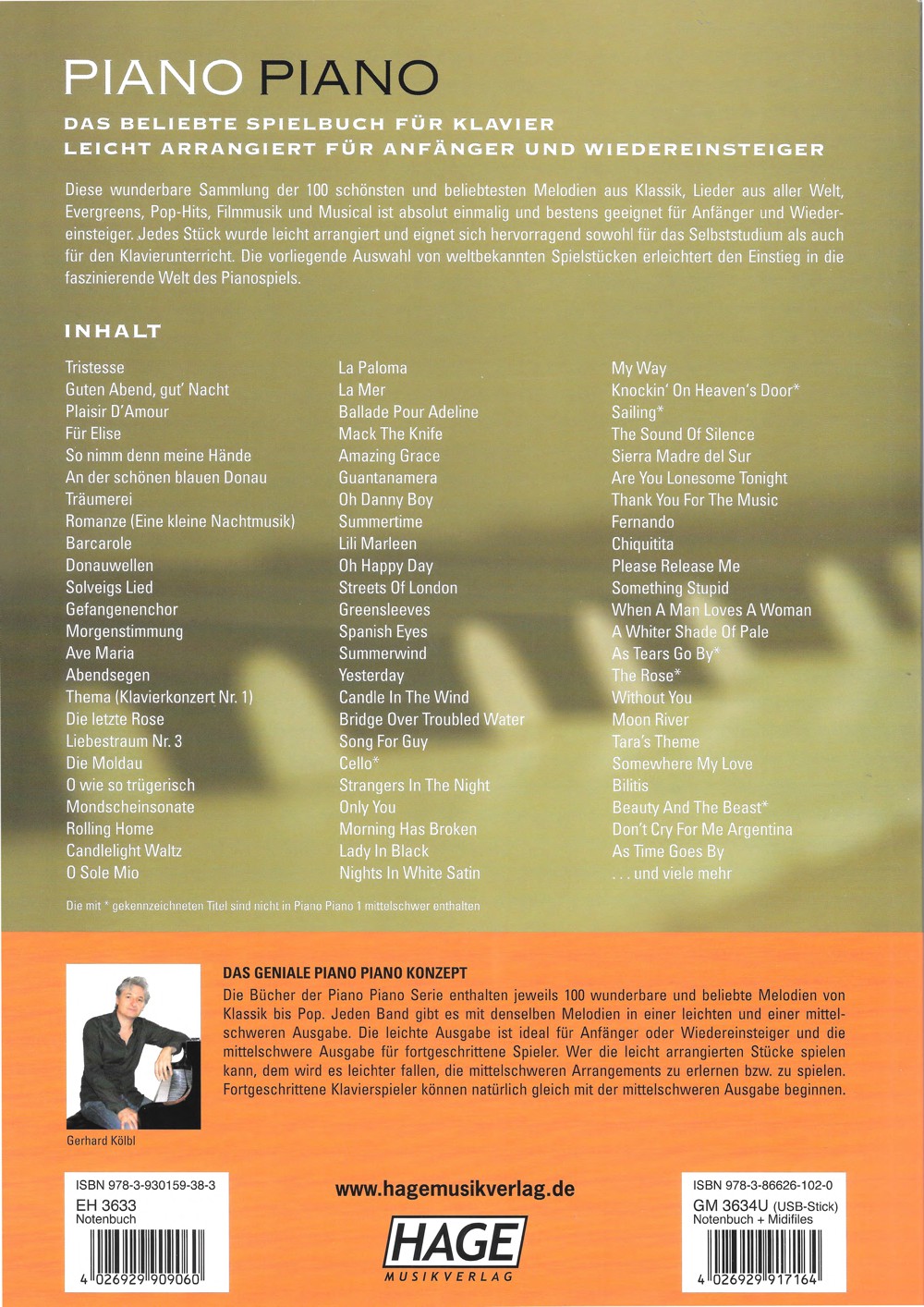 Eine Ausgabe unserer Bestseller-Serie. Schöne Sammlung der 100 schönsten und beliebtesten Melodien aus Klassik, Lieder aus aller Welt, Evergreens, Pop-Hits und Filmmusik, Musical ist bedient jeden Spieler und ist daher bestens geeignet für Anfänger und Wiedereinsteiger. Alle Stücke sind variationsreich und leicht arrangiert. Der Band lässt sich für ebenso für den Unterricht einsetzen und wird ein langjähriger Begleiter am Klavier sein.